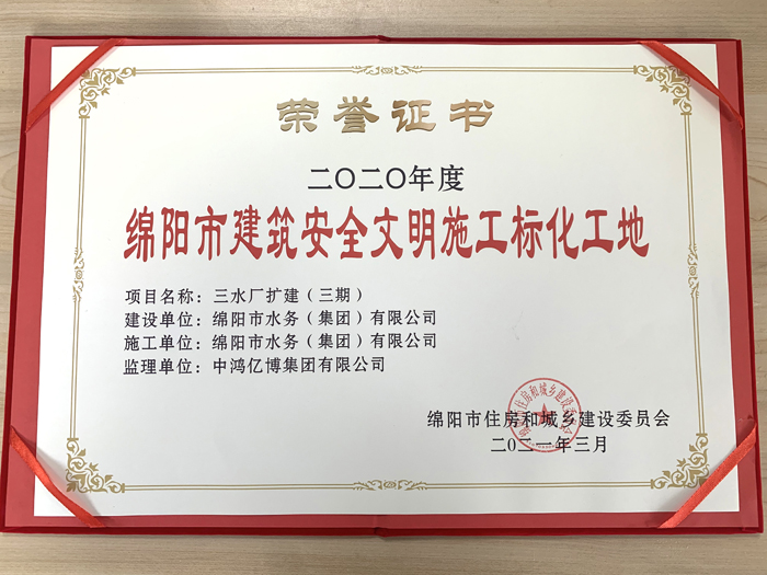 三水厂扩建(三期)工程荣获绵阳市市级“标化工地”称号